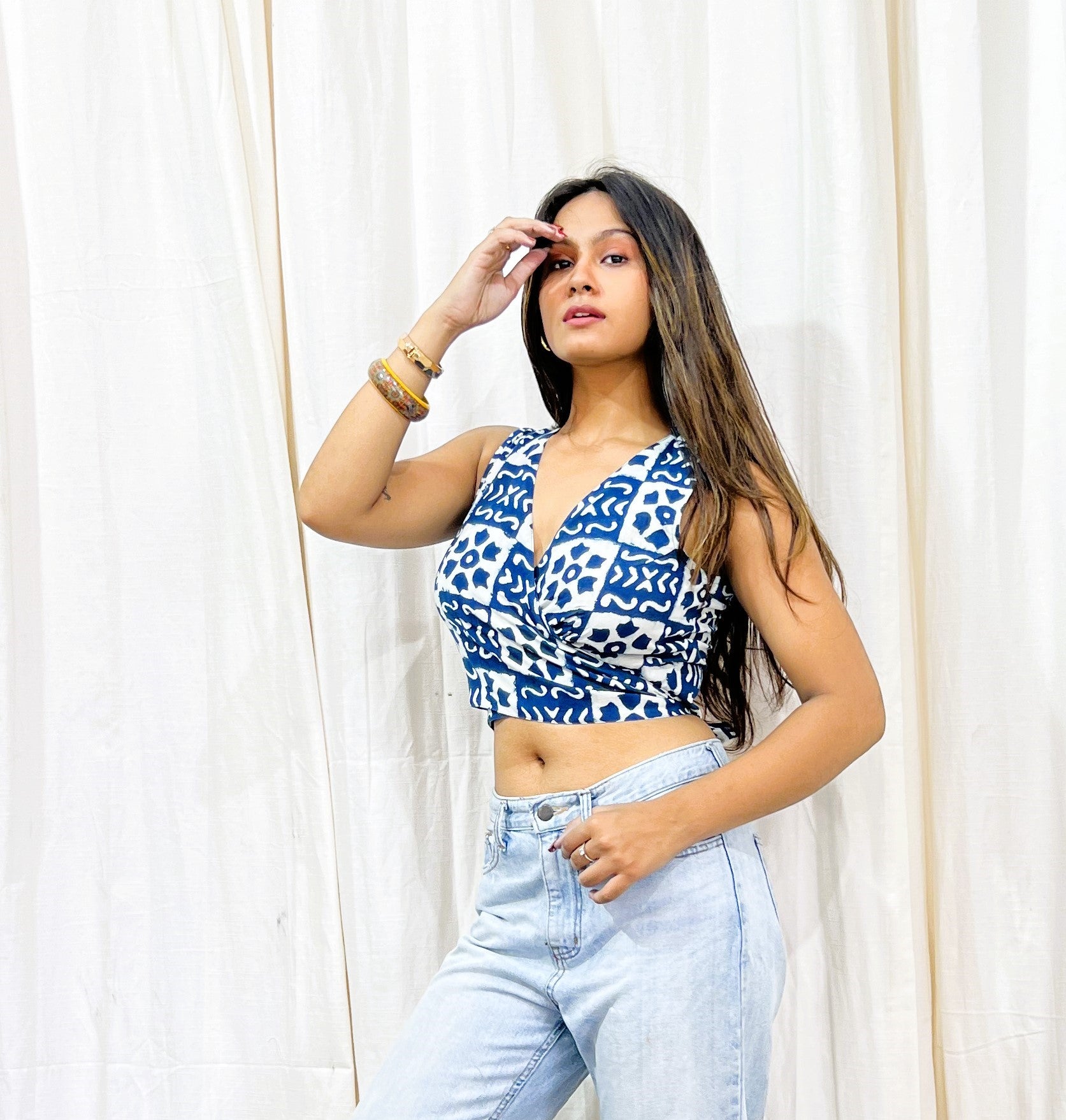 A perfect fusion of heritage and contemporary style, this Indigo Block Printed Sleeveless Wrap Around Top is designed to make a subtle yet striking statement. Featuring handblock prints on breathable cotton, its flattering wrap silhouette adjusts to fit just right.