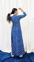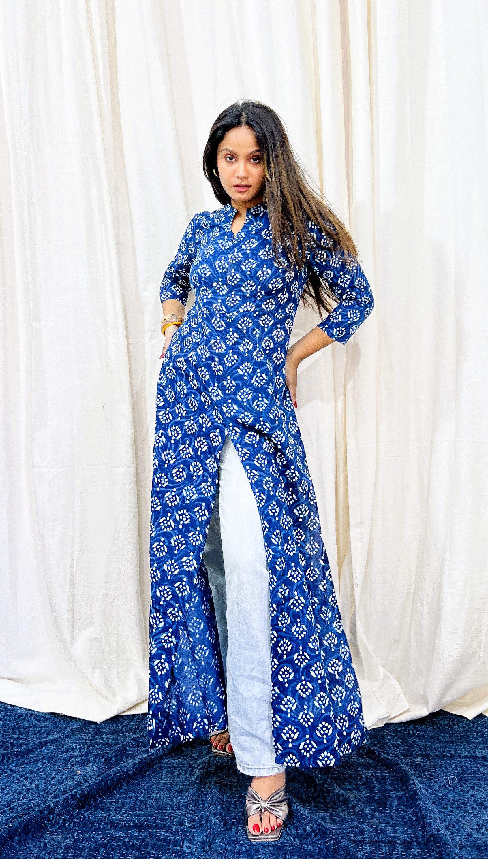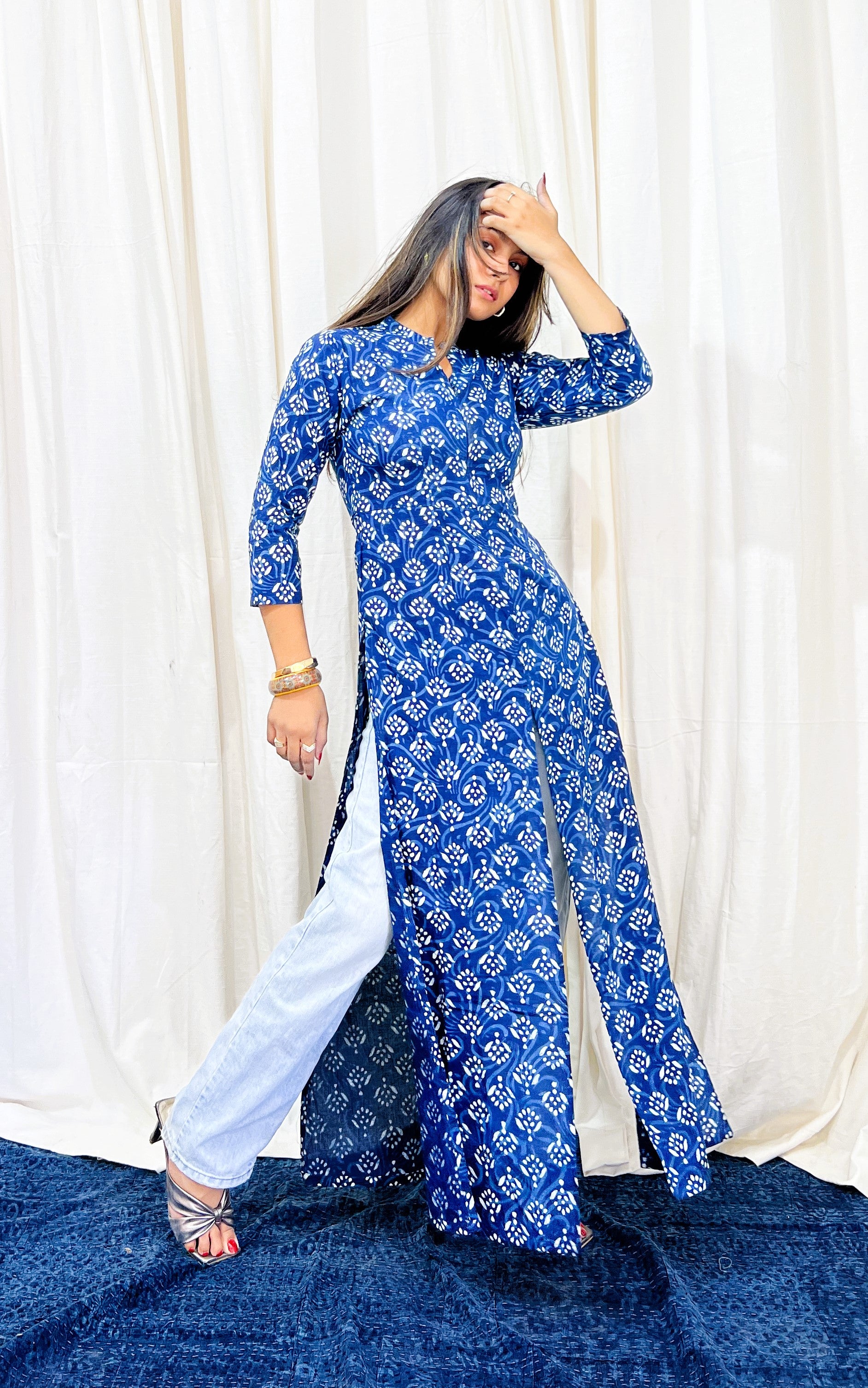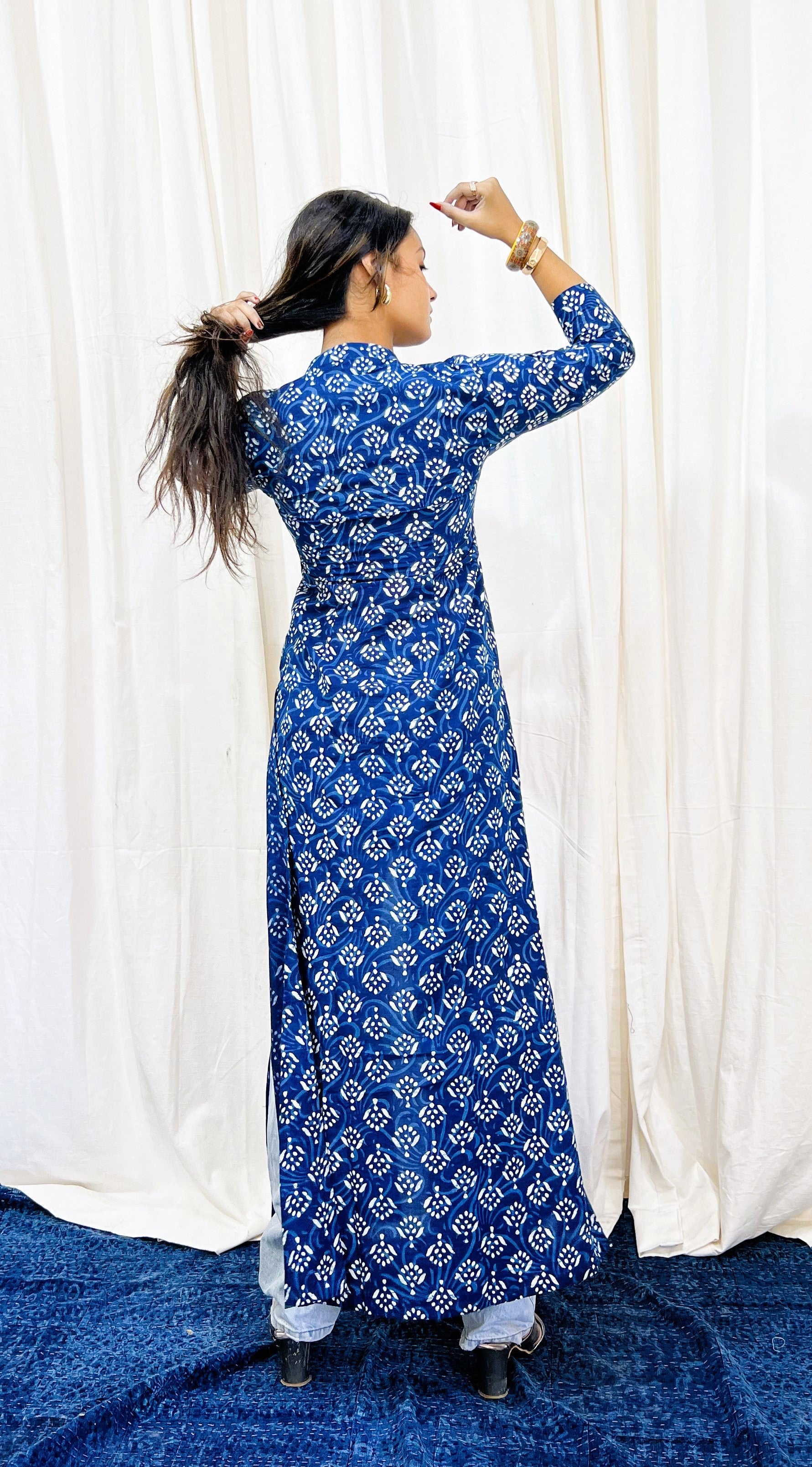 This hand block-printed floor-length zip kurti is a stylish and contemporary take on traditional ethnic wear. It combines the elegance of hand block prints with the modern touch of a front zipper, making it both functional and fashionable. These kurtis are perfect for festive occasions, casual outings, or even office wear, depending on the print and fabric.